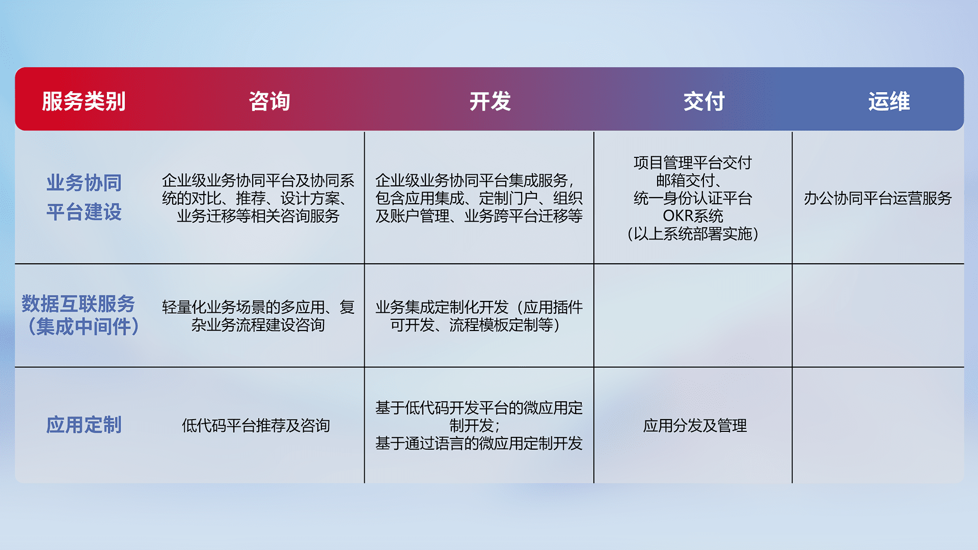 针对钉钉、、、企微、、、、IDaas等平台级产品提供产品的规划、、方案、、、交付、、、定制化开发等服务,,,,实现如统一协同办公、、、、智能客户服务、、、混合会议管理、、、、智能数据查询、、等业务场景,,,,实现数字化转型。。。。